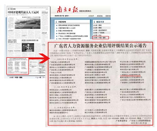根據(jù)廣東省整頓和規(guī)范市場經(jīng)濟秩序領(lǐng)導(dǎo)小組辦公室《轉(zhuǎn)發(fā)全國整規(guī)辦 國資委<關(guān)于印發(fā)商會協(xié)會行業(yè)信用建設(shè)工作指導(dǎo)意見>》,及人力資源社會保障部關(guān)于進一步加強人力資源市場監(jiān)管有關(guān)工作的通知精神,廣東勞動學(xué)會、廣東省人力資源管理協(xié)會(以下簡稱“兩會”)在華南理工大學(xué)信用研究中心、廣東省信用擔保協(xié)會等單位支持下,根據(jù)獨立、客觀、公正、科學(xué)的評級原則,履行必要的信息征集和評級程序,對受評人力資源服務(wù)企業(yè)的經(jīng)營能力、勞動合同履約情況、社保激交、工資支付、爭議仲裁、企業(yè)素質(zhì)、發(fā)展前景等因素進行了評審,同時參考了宏觀經(jīng)濟形勢、行業(yè)產(chǎn)業(yè)政策、市場需求等因素對企業(yè)的影響。經(jīng)廣東省人力資源服務(wù)企業(yè)信用評審委員會評議審定,征求各地市人力資源社會保障局意見,并經(jīng)公示程序,現(xiàn)將2009年第1批信用等級達A級以上的信用企業(yè)予以公告。本公告內(nèi)容同時刊登在南方日報2010年3月27日06版、登載于“廣東人力資源網(wǎng)”www.12333.com