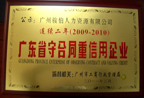 熱烈慶祝廣州駿伯人力資源有限公司榮獲廣州市2010年度廣東省“守合同重信用企業(yè)”。附:公示通告。