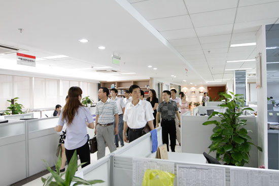 (企業(yè)家們?cè)诠ぷ魅藛T的帶領(lǐng)下參觀總部辦公區(qū))